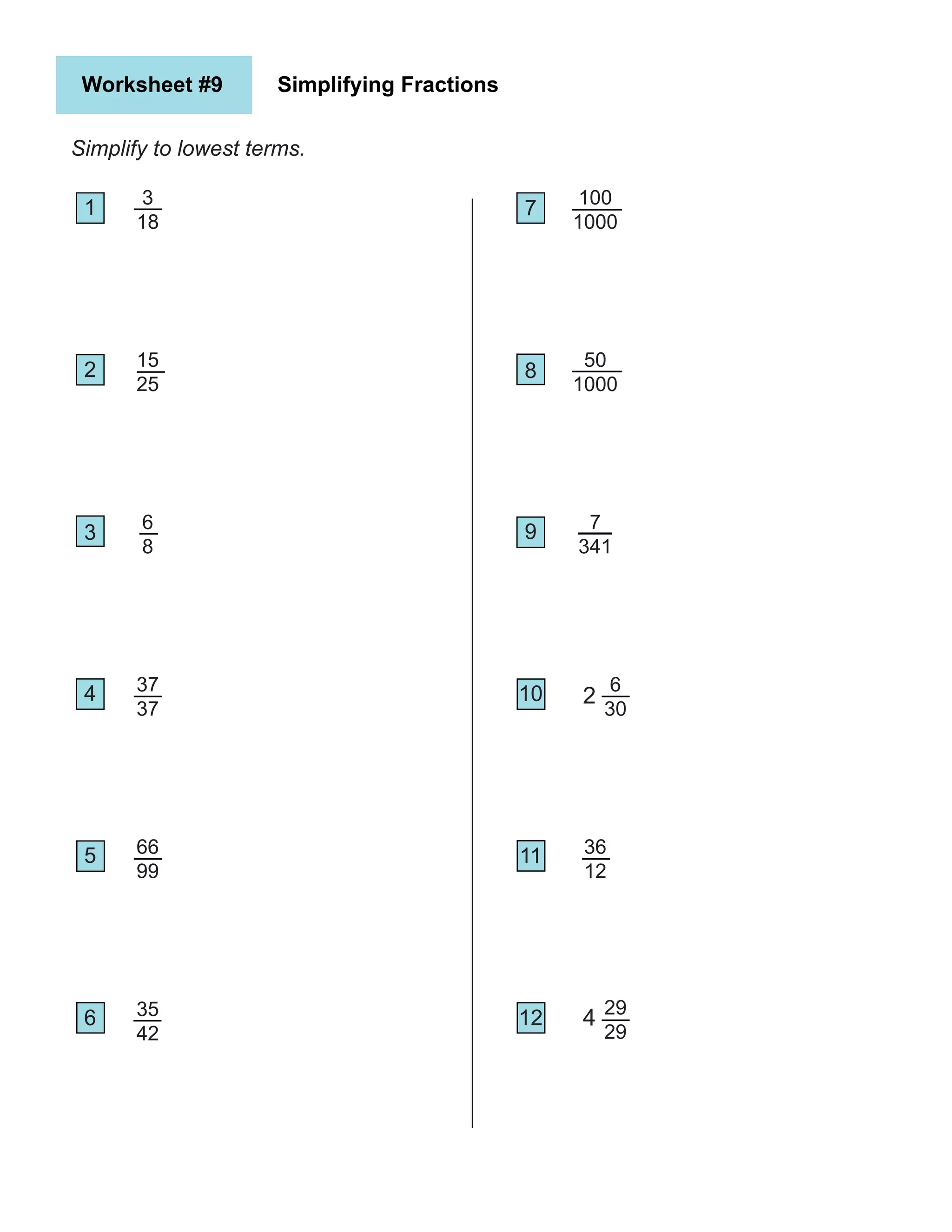 The Math Worksheet Site.com -- Reducing Fractions to Lowest Terms The Math Worksheet Site.com -- Reducing Fractions to Lowest Terms Reducing Fractions to Lowest Terms Number of Problems 20 25 28 30 35 40 50 Difficulty 1 (Easiest) 2 3 4 (Hardest) Include Improper Fractions? No Yes Instructions Reduce each fraction to lowest terms. Simplify each fraction to lowest terms. Do not print instructions on the worksheet.